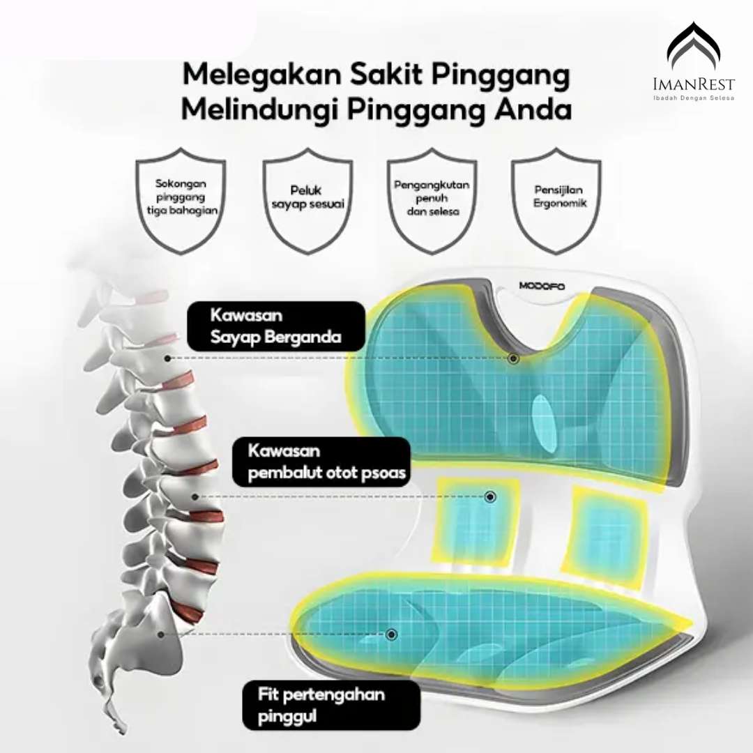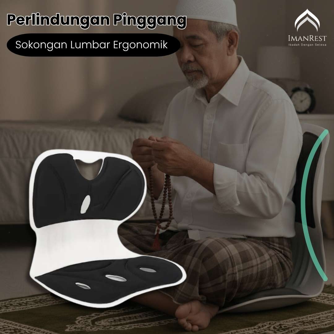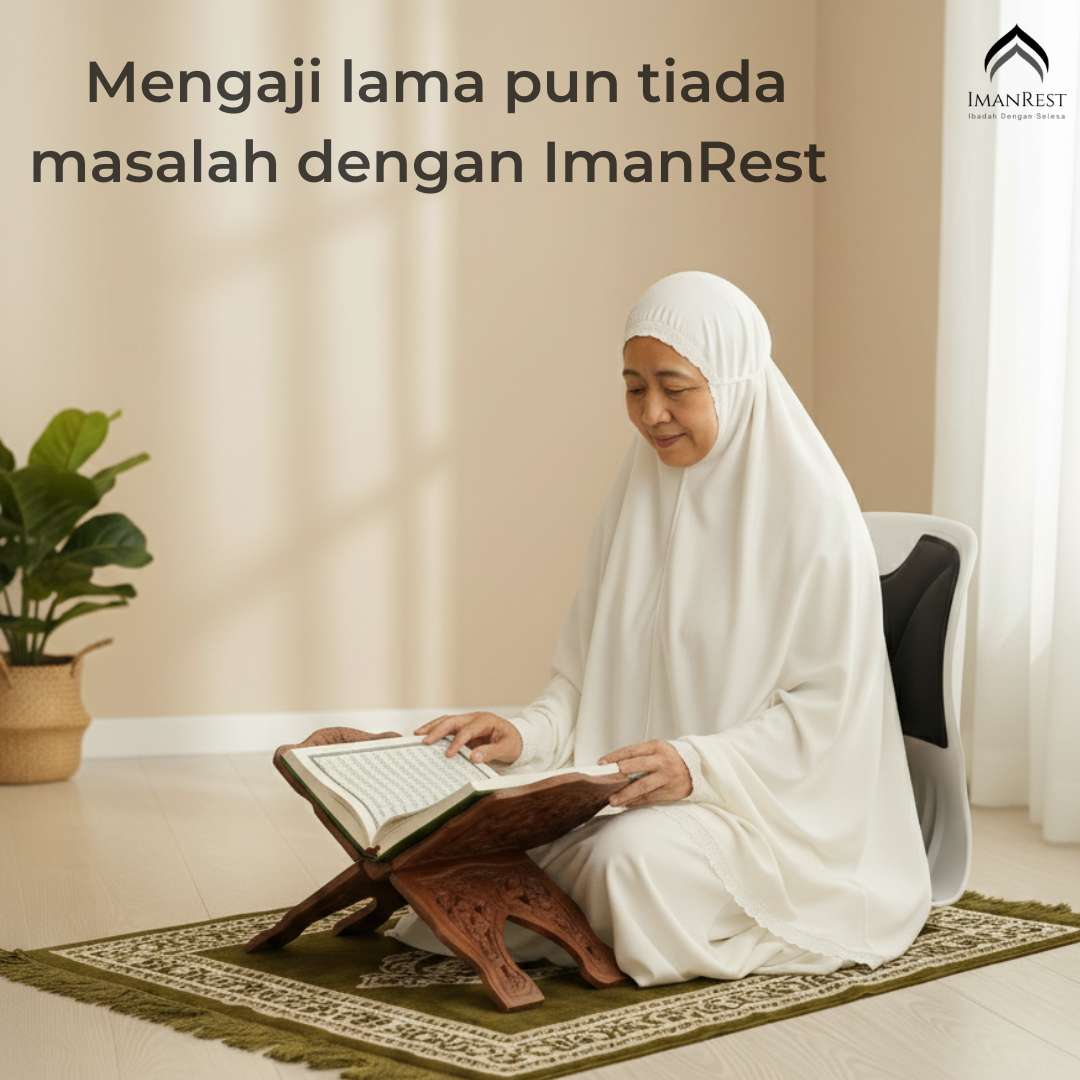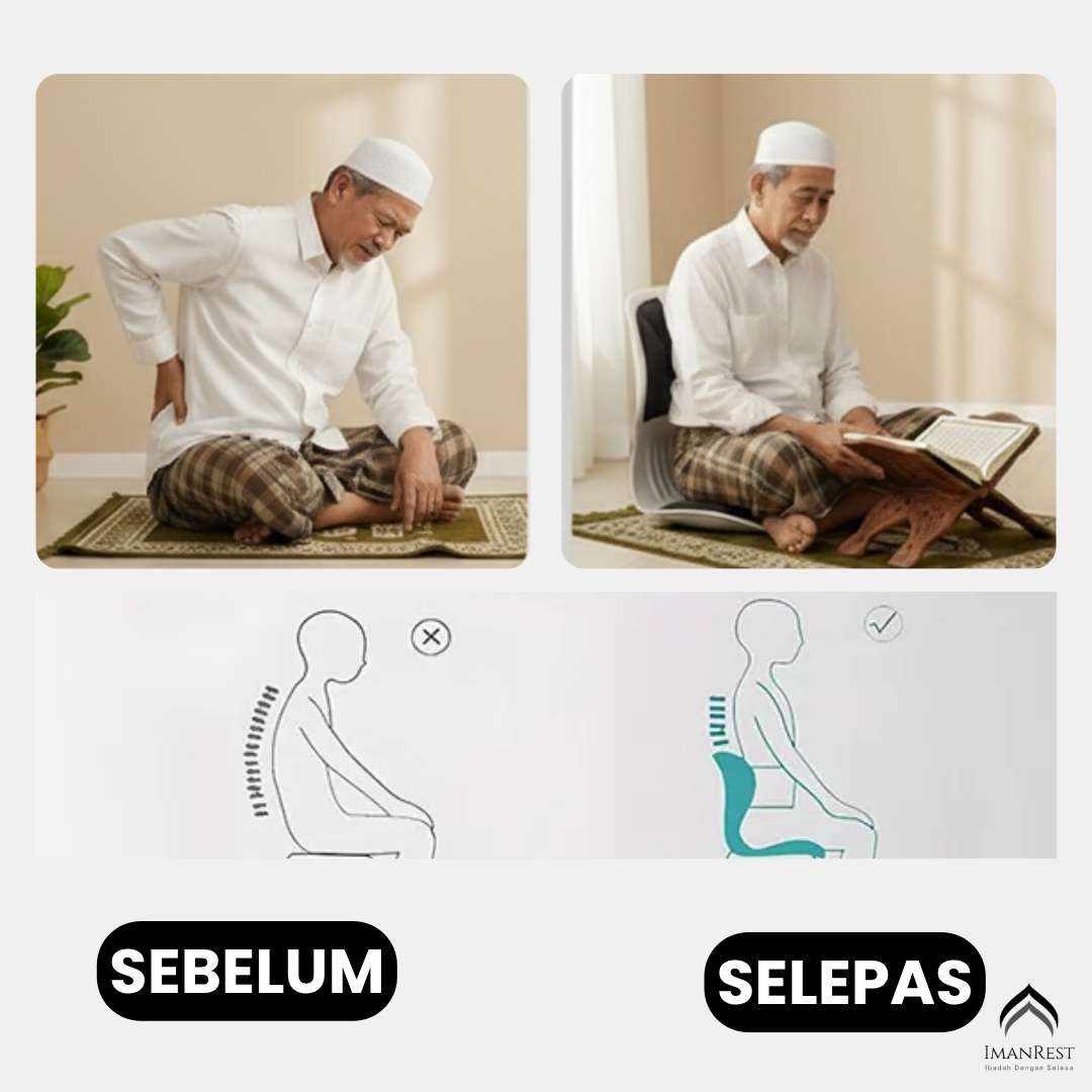 Kerusi ImanRest direka khas untuk warga emas, ibu ayah, atau sesiapa yang mudah rasa sakit lutut dan pinggang bila duduk bersila di lantai. Sangat sesuai digunakan masa mengaji, berzikir, atau menunggu waktu solat.